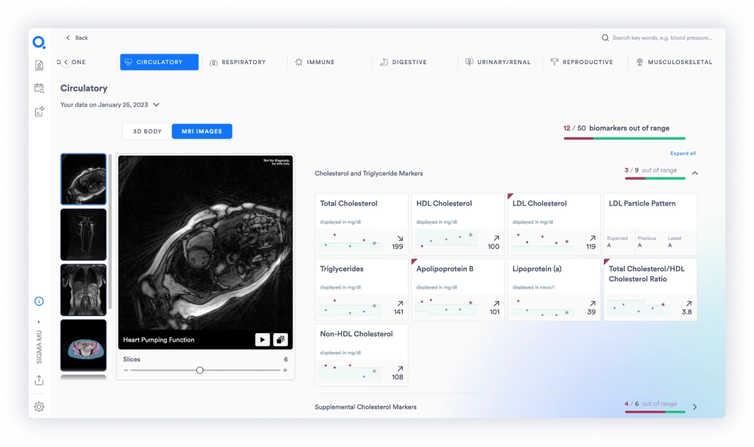 The summary page displays your profile, 3D whole body reconstruction and surfaces flagged biomarkers and imaging